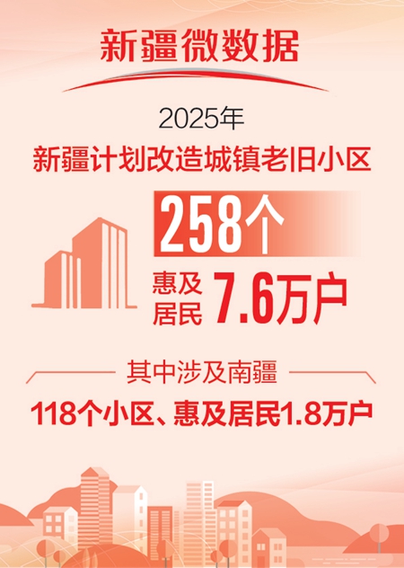 记者从自治区住房和城乡建设厅获悉:2025年,新疆将继续大力实施城镇老旧小区改造,计划改造城镇老旧小区258个、惠及居民7.6万户。其中涉及南疆118个小区、惠及居民1.8万户。