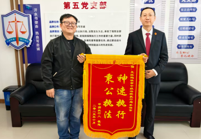 近日,克拉玛依市中级人民法院执行局收到一面写有“神速执行 秉公执法”字样的锦旗,申请执行人崔某紧紧握住执行干警李达的手激动不已:“谢谢法官,我的装修钱终于要回来了!”