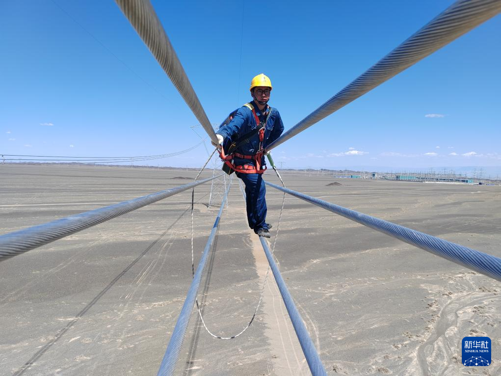 新疆送变电有限公司员工在哈密—重庆±800千伏特高压直流输电线路上开展走线检查工作(2025年6月19日摄)。新华社发(杜金铭 摄)