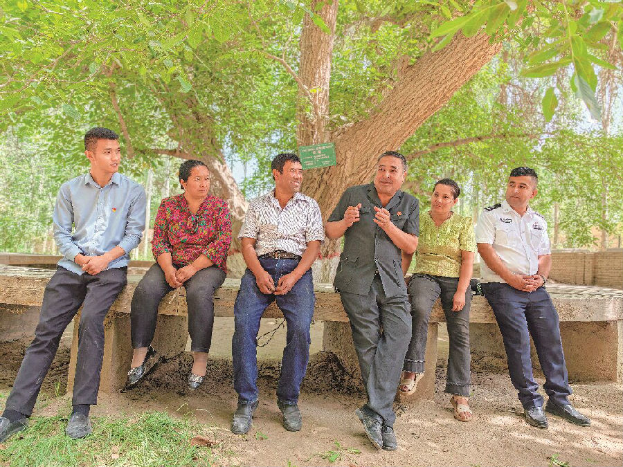 新疆法制报网讯 8月21日,皮山县人民法院桑株人民法庭庭长阿卜力米提·阿卜杜热曼(右三)受桑株镇社会治安综合治理中心委派,联合该镇司法所工作人员走进核桃种植园,调解一起因采收核桃引发的劳资纠纷。石榴云/新疆法治报记者 赵书城 摄